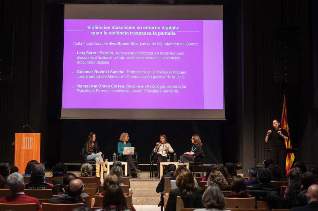 L’acte també ha comptat amb la taula rodona: “Violències Masclistes en entorns digitals: quan la violència traspassa la pantalla”, moderada per la jurista de l’Ajuntament de Girona, Eva Beneit Vila; i en la qual hi han participat la professora de Ciències polítiques i coordinadora del Màster en Comunicació i política de la Universitat de Girona, Guiomar Rovira Sancho; la doctora en Psicologia, experta en Psicologia Forense i violència sexual i Psicologia i psicòloga sanitària, Montserrat Bravo Correa; i la jurista especialitzada en drets humans, discursos d’incitació a l’odi, violències sexuals i violències masclistes digitals, Laia Serra Perelló.