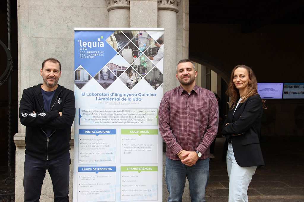 Una imatge del regidor d’Acció Climàtica, Sergi Cot Cantalosella; la investigadora de Lequia Alexandra Lucia Popartan i el director de l’Institut de Medi Ambient de la UdG i investigador de Lequia, Ignasi Rodríguez-Roda Layret.