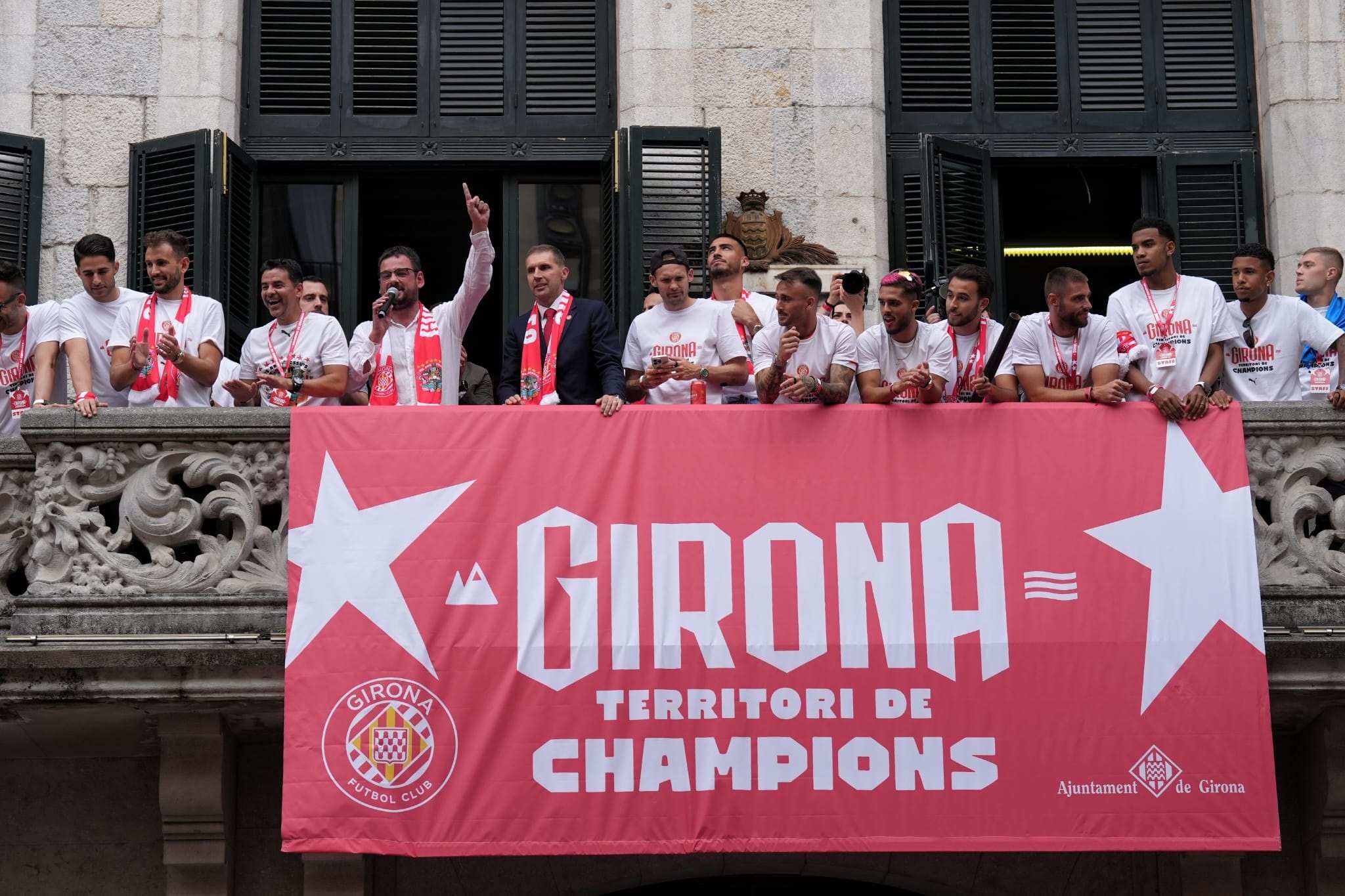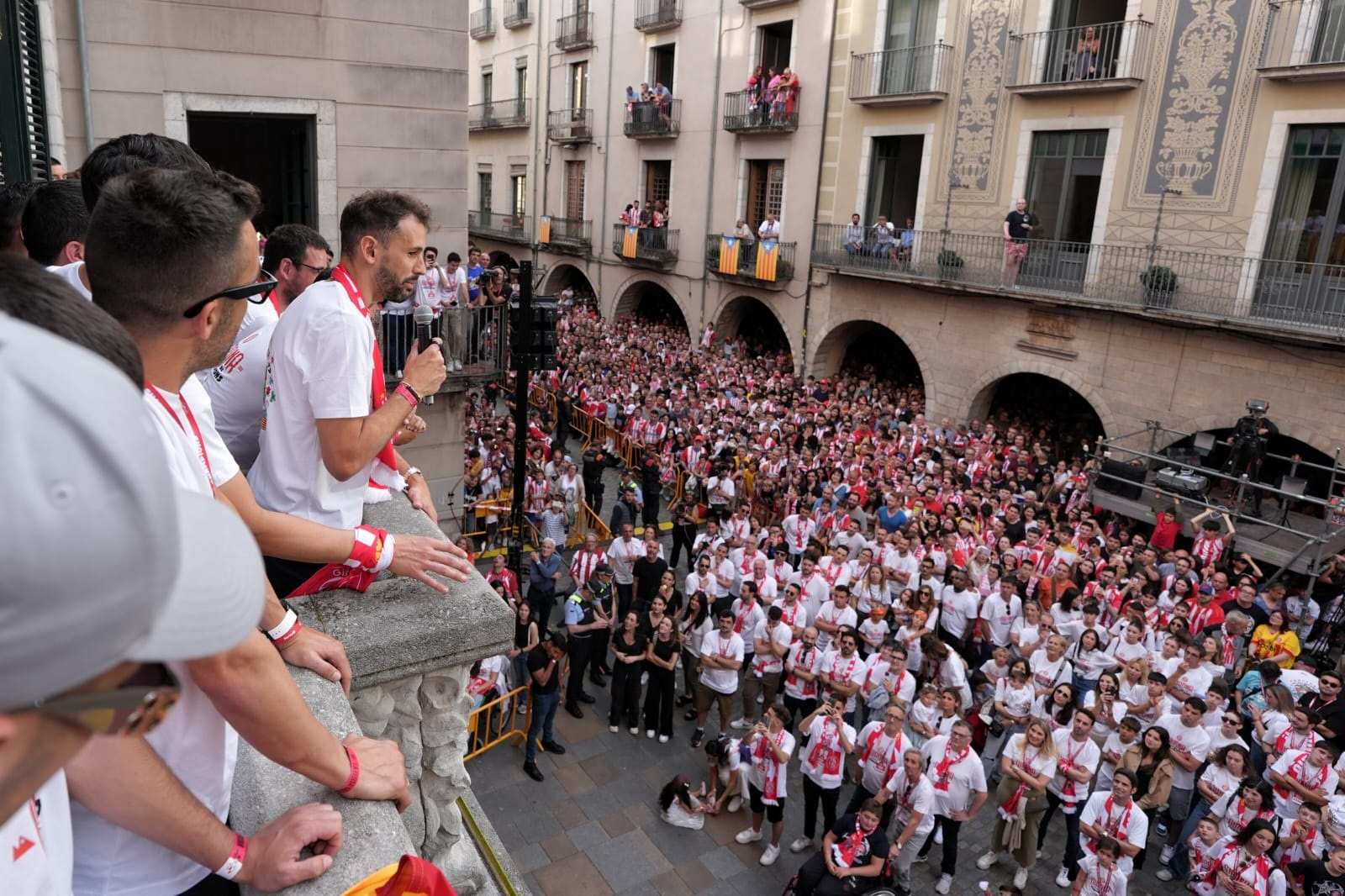 Després de la recepció, que s’ha fet al despatx d’Alcaldia, els jugadors i el cos tècnic acompanyats per l’alcalde de Girona, Lluc Salellas i Vilar; el president del Girona FC, Delfí Geli, i l’entrenador del primer equip del Girona FC, Míchel Sánchez, han sortit al balcó del consistori per adreçar-se als aficionats i aficionades que havien vingut a la plaça del Vi per celebrar la classificació europea.