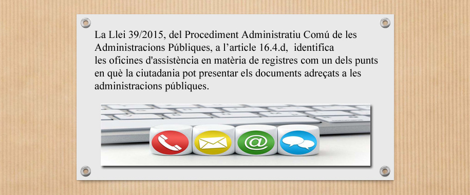 La Llei 39/2015, d’1 d’octubre, del Procediment Administratiu Comú de les Administracions (en endavant LPACAP), en el seu article 16.4.d) identifica les oficines d'assistència en matèria de registres com un dels punts en què la ciutadania pot presentar els documents adreçats a les administracions públiques.