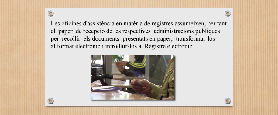 Les oficines d'assistència en matèria de registres assumeixen, per tant, el paper de recepció de les respectives administracions públiques per recollir els documents presentats en paper, transformar-los al format electrònic i introduir-los al Registre electrònic. Les oficines d'assistència en matèria de registres informaran les persones interessades que la presentació presencial de documents quan existeix una obligació de relacionar-se amb les administracions per mitjans electrònics no es dóna per vàlida.
