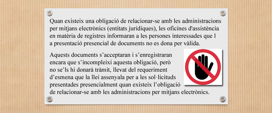 Aquests documents s’acceptaran i s’enregistraran encara que s'incompleixi aquesta obligació, però no se'ls hi donarà tràmit, llevat del requeriment d'esmena que la llei assenyala per a les sol·licituds presentades presencialment quan existeix l'obligació de relacionar-se amb les administracions per mitjans electrònics.