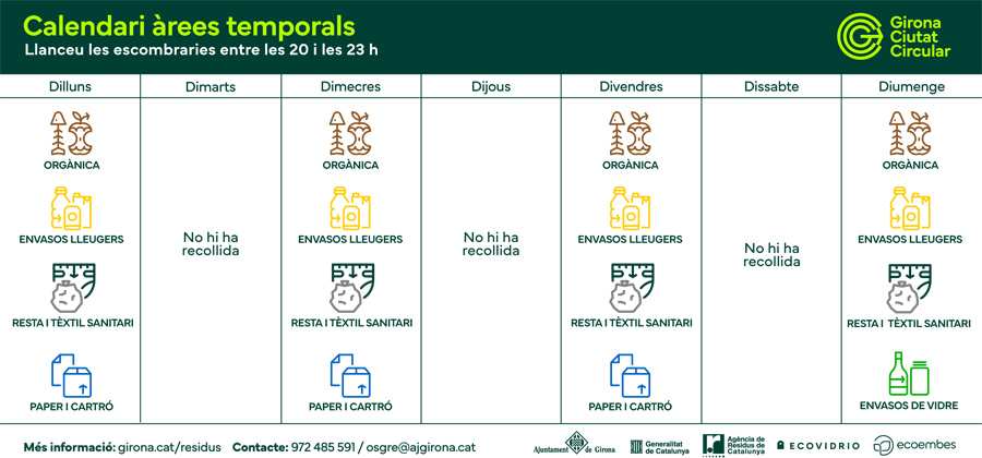 A partir de l'1 de desembre, s'augmentaran els tipus de fraccions que es podran llençar cada dia en el model de recollida de residus d'àrees temporals. Concretament, cada dia que es col·loqui l'àrea temporal -dilluns, dimecres, divendres i diumenge- s'hi podrà llençar orgànica, resta i tèxtil sanitari, i envasos. A més, els dilluns, els dimecres i els divendres s'hi podrà abocar paper i els diumenges, vidre. Per aquest motiu, hi haurà un nou calendari que es podrà descarregar del web www.girona.cat/areestemporals