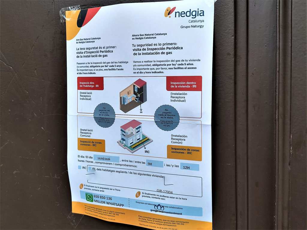 - El titular pot escollir si farà la inspecció a través de Nedgia (empresa distribuïdora) o bé contracta un instal·lador autoritzat. Si el titular no comunica la voluntat de contractar un altre instal·lador i no en remet el certificat d’inspecció, Nedgia farà la inspecció de la instal·lació. Comunicarà la data i rang horari de 3 hores previstos per fer la inspecció, amb una antelació mínima de 5 dies. Habitualment pengen un cartell a cada finca amb tota la informació.
