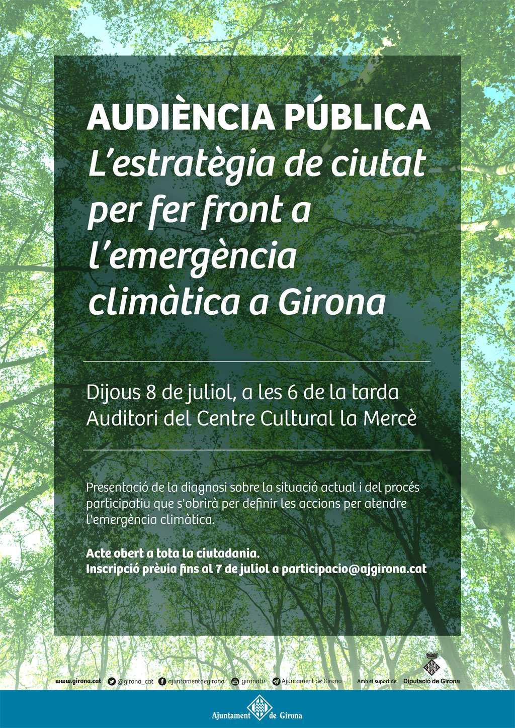 L’Ajuntament de Girona ha organitzat, el pròxim dijous 8 de juliol, una audiència pública sobre l’emergència climàtica. La trobada és el punt de partida per començar a definir conjuntament, entre l’administració, les entitats i la ciutadania, les accions que s’han d’emprendre al municipi per fer front a aquesta situació. L’acte tindrà lloc a l’Auditori del Centre Cultural la Mercè a les 18 h, i està obert a tothom.