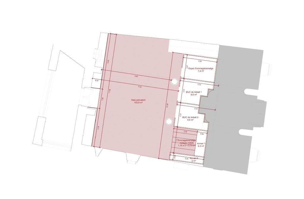 Està previst crear espais de diferents dimensions segons les necessitats del treball amb mòduls mòbils. L’objectiu és permetre tant la simultaneïtat del treball individual de 4 o 5 creadors/ores digitals, amb aïllament visual, com la possibilitat de treball amb ocupació de tot l’espai disponible sense particions. L’aforament serà de menys de 50 persones.