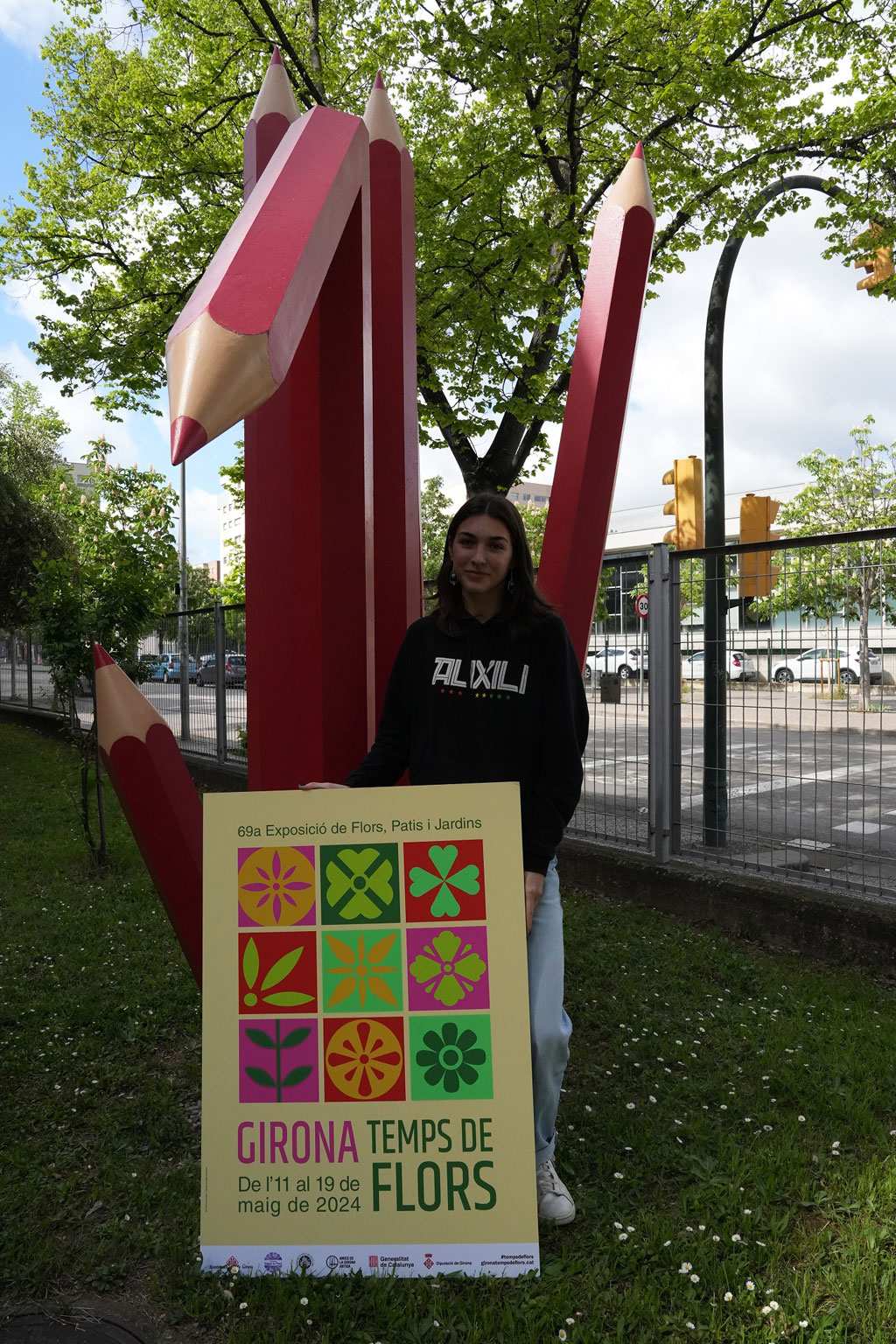 Aquest any, l’autora de l’obra és l’alumna de segon de batxillerat artístic de l’Institut Santiago Sobrequés Ruth Remus i González. “Amb aquest cartell volia representar la dualitat que hi ha entre la natura i l’espai urbà que representa Temps de Flors, i per això hi ha unes figures geomètriques que son com unes rajoles en què apareixen flors”, ha explicat.