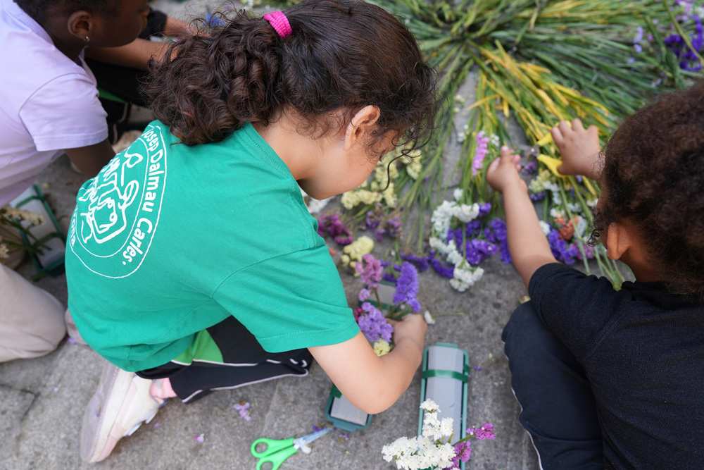 La proposta ha estat ideada per l’artista Nuxu Perpinyà, qui alhora ajuda els infants a fer les composicions florals i a plasmar-les entre les figures.