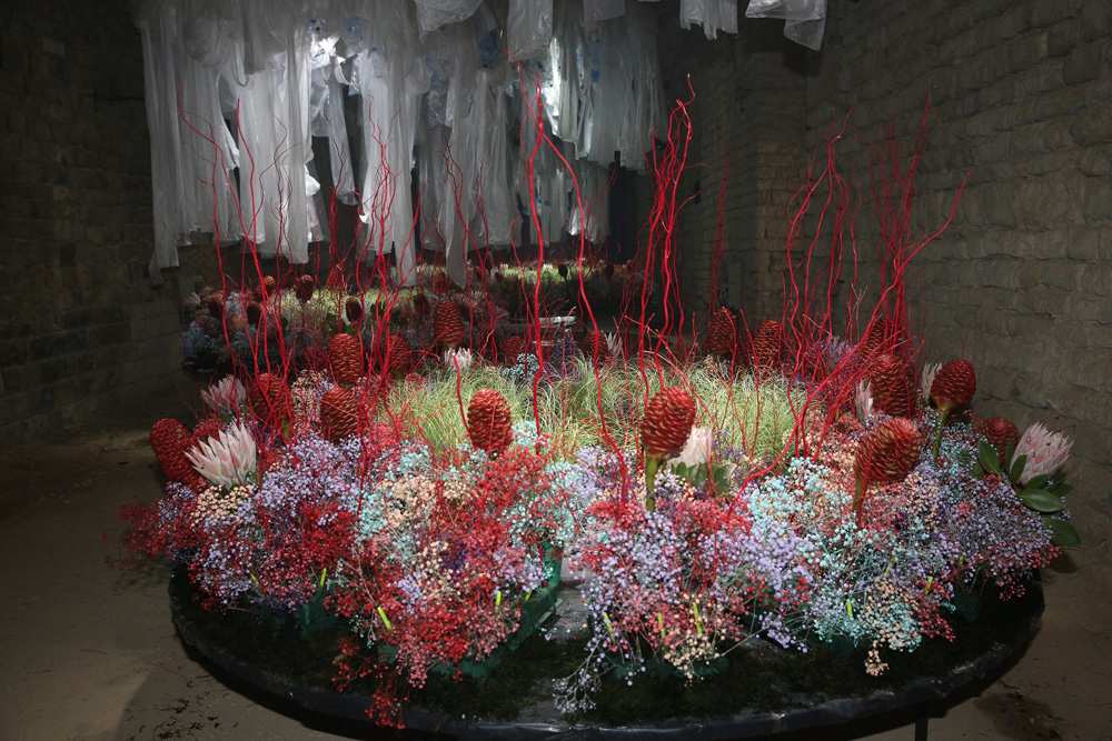 La instal·lació efímera es materialitza a partir de tres elements. A terra hi ha la flora marina, formada per flors acolorides i frondoses que representen la flora subaquàtica dels oceans. Gypsophilla de colors diversos formen la base cromàtica de l'ornamentació amb càrex (cintes verdes); plantes grases carnoses i molsudes; birchs (branques cargolades de color corall) i Heliconia. Al sostre hi ha un volum suspès construït a partir de l’acumulació d’ampolles de plàstic. I, en la totalitat de la sala, hi ha elements intangibles, sensitius i perceptius, que a través de l’aroma, la llum, l’àudio i el fum ajuden a crear un espai dinàmic, màgic i misteriós, que proposa una immersió en un món subaquàtic que està amenaçat per les acumulacions de brossa no biodegradable.
