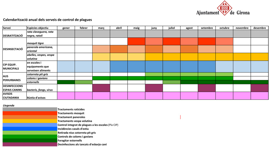 L'Ajuntament de Girona desenvolupa anualment les campanyes de prevenció i control de plagues a tots els barris de la ciutat, encaminades a controlar les poblacions de les espècies plaga i minimitzar els efectes de la seva presència. Per això, se segueixen les directrius del control integrat de plagues i s'actua mitjançant un pla que inclou inspeccions, diagnosis, proposta de mesures de prevenció i correctores, i l'execució de controls actius (utilitzant en un últim terme els tractaments biocides). Tot amb l'objectiu de controlar les poblacions d'espècies plaga fins a uns llindars que siguin segurs i minimitzin els riscos per a les persones i l'impacte sobre les activitats i el medi ambient.