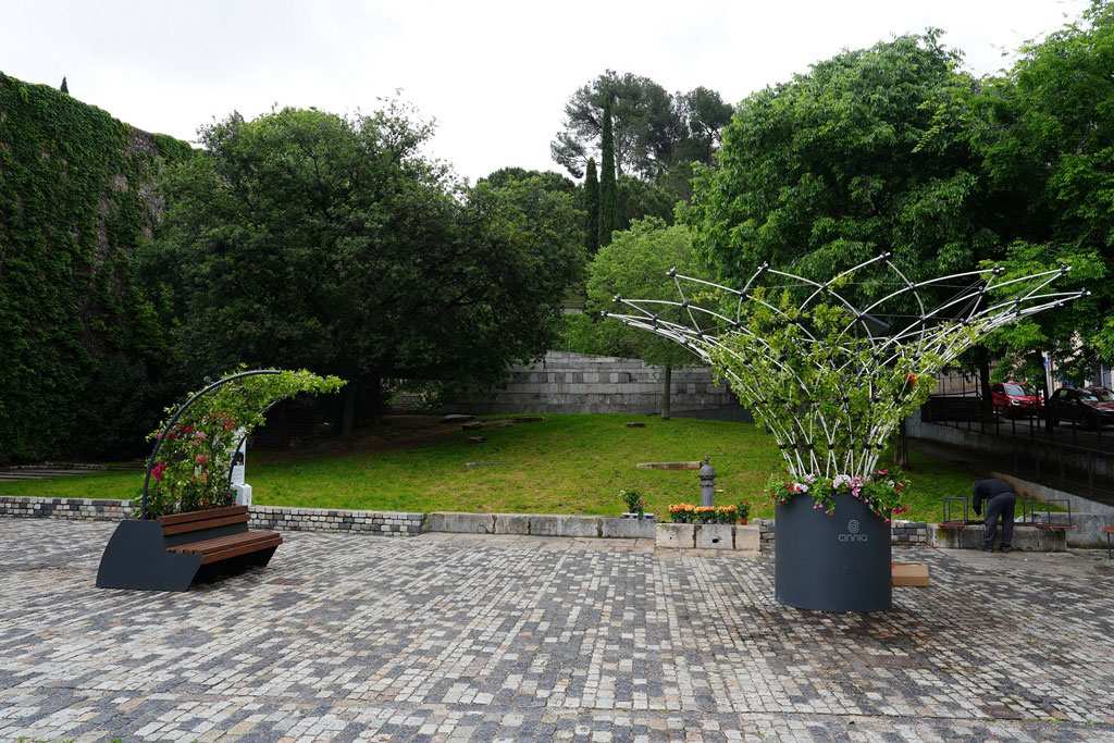Durant Girona, Temps de Flors, l’Ajuntament de Girona provarà dos refugis climàtics urbans per combatre les illes de calor en places dures. Es tracta de dos bancs ornamentats amb sostre de vegetació —una mini corol·la vegetalitzada i un banc GreenFresh— exposats temporalment per l’empresa Cinnia Tech SLU, especialitzada en disseny d’espais urbans sostenibles, i decorats floralment per a l’ocasió.