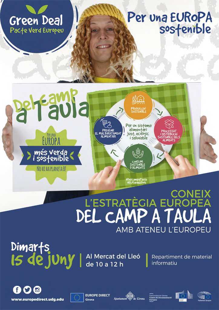 El Centre Europe Direct Girona de la Universitat de Girona i el Gabinet d’Estudis Socials i Europeus de l’Ajuntament de Girona promouen una campanya informativa sobre l’estratègia del Camp a la Taula que tindrà lloc el dimarts dia 15 de juny de 10h a 12h al Mercat del Lleó. A banda del repartiment de material informatiu, l’esdeveniment comptarà amb l’actuació de l’Ateneu l’Europeu, un peculiar personatge que dona a conèixer la Unió Europea a través de dinamitzacions i actuacions teatrals per a tots els públics.