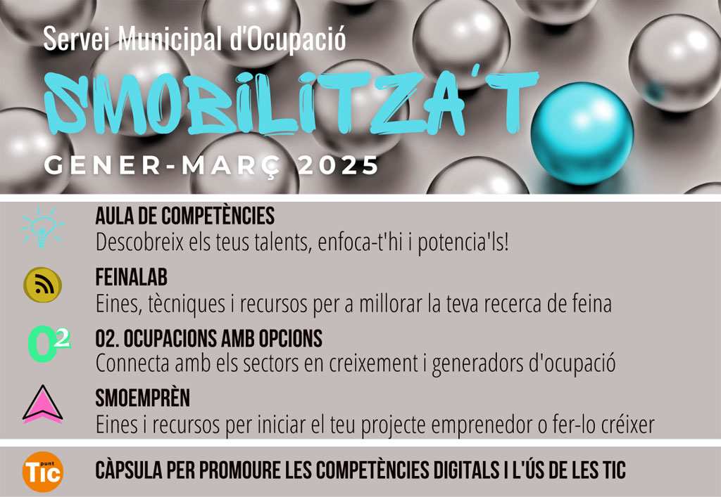L’Ajuntament de Girona ha programat per aquest primer trimestre del 2025, de gener a març, un total de 21 activitats gratuïtes per millorar l’ocupació laboral. Es tracta del programa SMObilitza’t, que té per objectiu oferir eines i recursos a la ciutadania per a la recerca de feina, promoure l’autoconeixement i la definició d’objectius laborals concrets i realistes, i oferir informació actualitzada dels principals sectors d’ocupació.