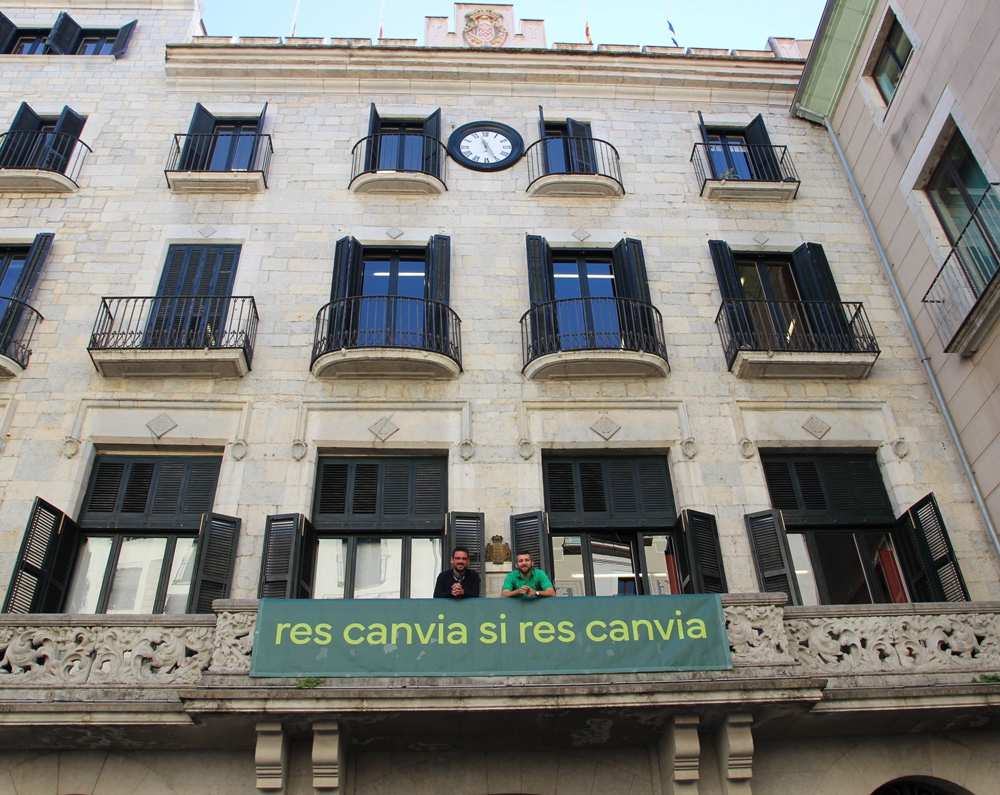 Nota: dues imatges de l’alcalde Lluc Salellas i Vilar i del regidor d’Acció Climàtica Sergi Cot Cantalosella amb la lona “Res canvia si res canvia” i en roda de premsa.