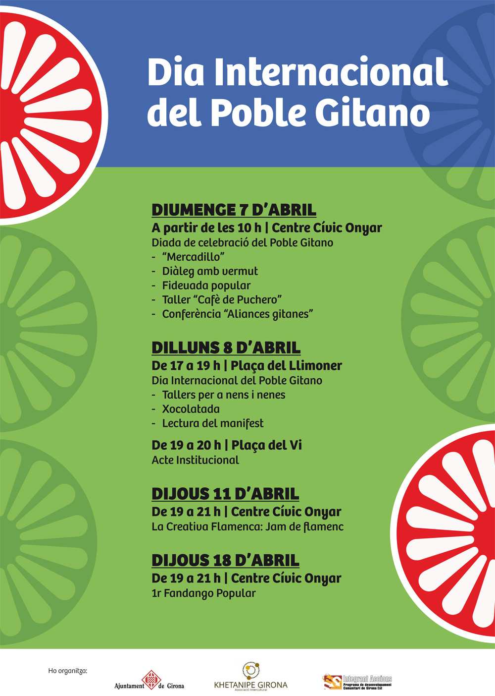 El programa d’activitats, però, començarà el dia abans, el diumenge 7 d’abril, amb diferents propostes al Centre Cívic Onyar a partir de les 10 h. Hi haurà un mercat, un vermut per dialogar sobre la història del poble gitano, una fideuada popular, el taller “Cafè de Puchero” i la conferència “Aliances Gitanes” a càrrec de Demetrio Gómez, del país valencià, i Pastori Filigrana, de Sevilla. Aquestes activitats estan organitzades per l’Associació Khetanipé i compten amb la col·laboració de l’Ajuntament de Girona.