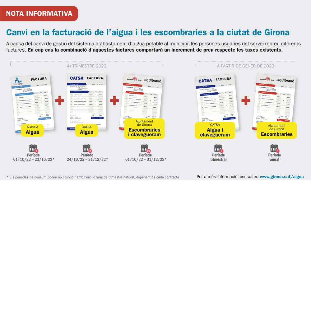 L’Ajuntament de Girona informa que aquesta setmana s’ha cobrat la taxa d’escombraries del quart trimestre del 2022, que correspon a 42,70 euros per als pisos, i 60,17 euros per a les cases. Anteriorment, aquesta taxa es cobrava juntament amb la factura de l’aigua, però a partir d’ara la cobrarà directament el consistori gironí, de forma separada, arran del canvi del nou sistema de gestió del servei d’abastament i distribució d’aigua potable a la ciutat, servei que ha passat a prestar-se per part de l’empresa pública Cicle de l’Aigua del Ter (CAT). Aquest canvi en cap cas afecta el preu que es paga pels serveis.