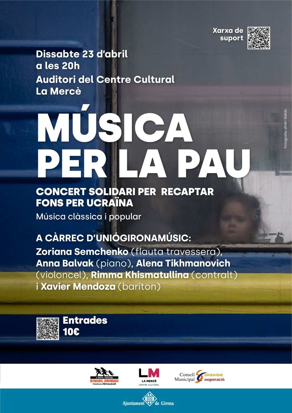 El dissabte 23 d’abril, a les vuit del vespre, el Centre Cultural la Mercè acollirà el concert solidari “Música per la Pau”, en benefici de les persones refugiades d’Ucraïna, amb el grup UnióGironaMúsics. La iniciativa, impulsada per l’Ajuntament de Girona i la Plataforma Girona Acull, vol mobilitzar recursos davant la situació d’emergència humanitària derivada de la guerra.