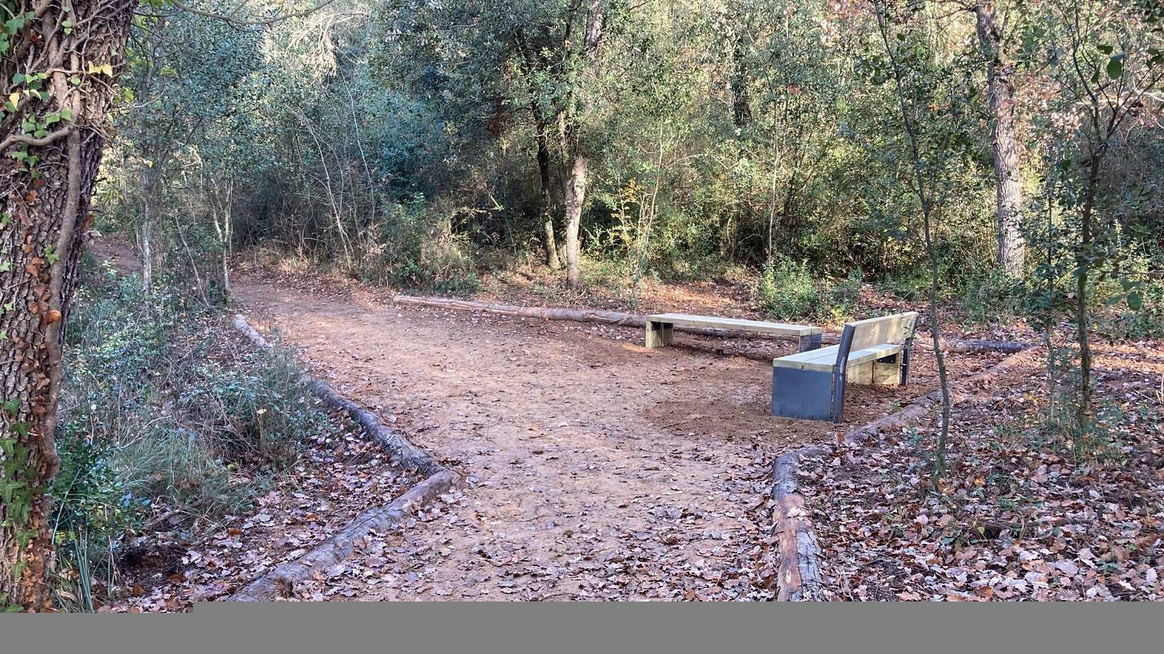 Alhora s’ha creat una zona d’estada dins la nova xarxa de camins anivellant el terreny i col·locant marges de fusta en tot el perímetre. En aquest punt s’hi han instal·lat dos bancs de fusta per poder descansar.
